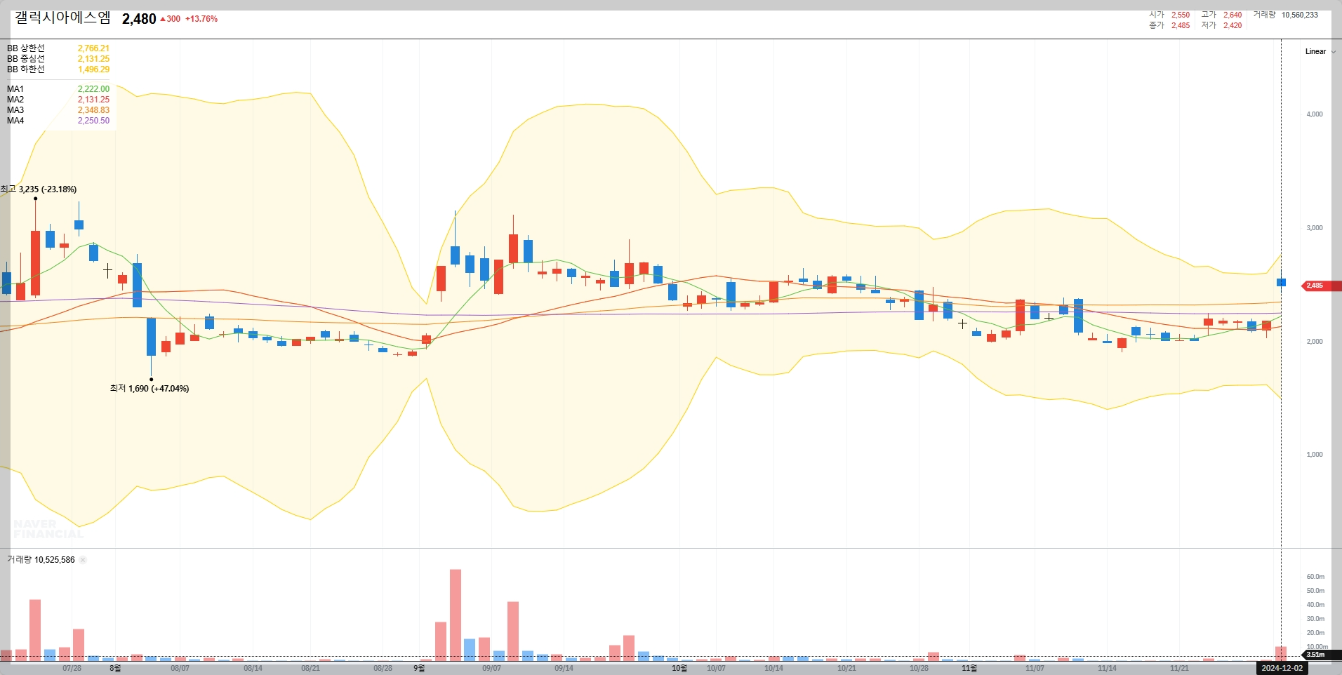 현재 갤럭시아에스엠의 주가는 2,480원으로 기록되고 있으며, 이는 최근 시장에서의 긍정적인 흐름을 반영하고 있습니다.