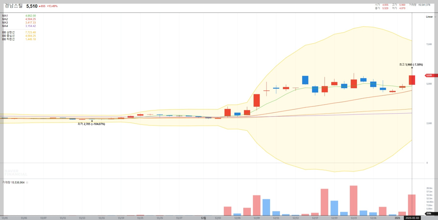 최근 경남스틸은 정치 테마주로 분류되며 급격한 주가 상승세를 보였습니다. 이는 홍준표 관련 테마주로 엮이며 대선 이슈와 철강 산업 회복이 맞물린 결과로 보입니다. 특히 2024년 12월 한 달 동안 경남스틸의 주가는 약 52% 상승하며 단기 과열 종목으로 지정될 가능성도 제기되었습니다.