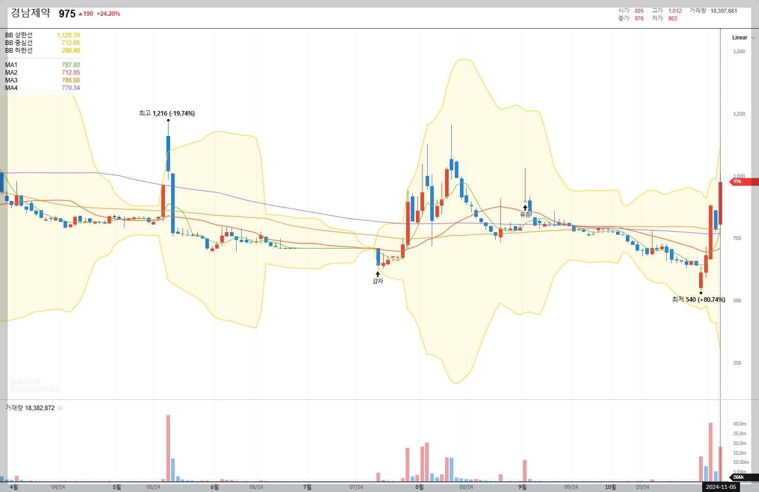 2024년 11월 5일 현재, 경남제약의 주식은 975원으로 전일 대비 24.20% 상승했습니다. 이러한 주가의 변동은 최근 발표된 알레르기 치료제 출시와 관련된 긍정적인 뉴스 때문인 것으로 추정됩니다.