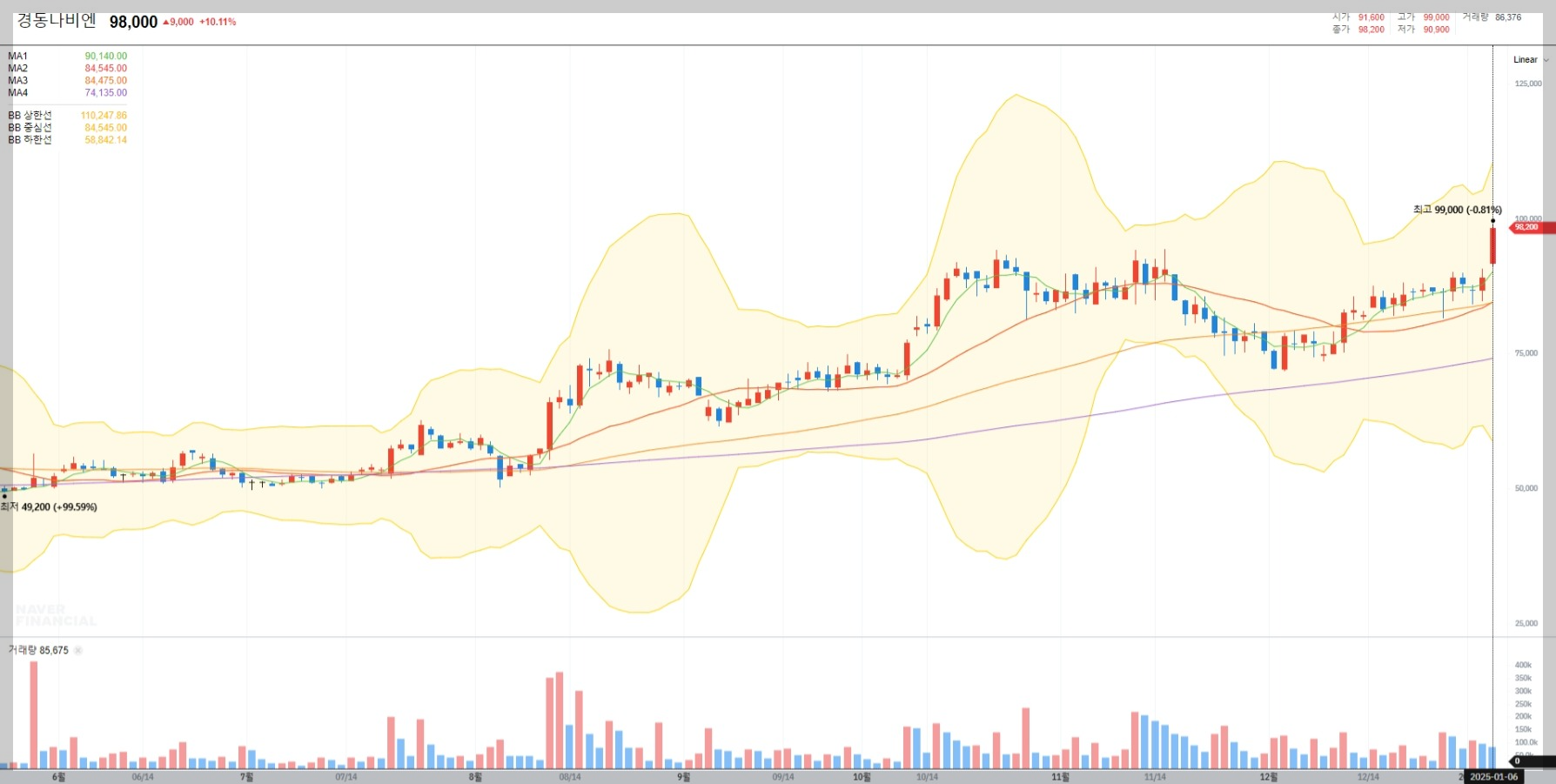 2025년 1월 6일 기준, 경동나비엔의 주가는 98,000원으로 전일 대비 10.11% 상승했습니다. 이는 최근 실적 개선과 북미 시장 성장 기대감이 반영된 결과입니다.