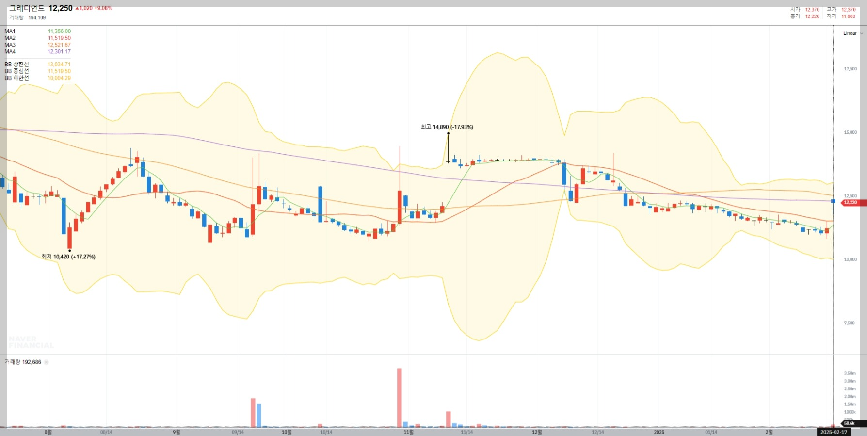 2025년 2월 17일 기준 그래디언트의 주가는 12,250원으로 전일 대비 9.08% 상승했습니다. 최근 하락세를 보이다 반등 조짐을 보이고 있으며, 거래량도 증가하는 추세입니다. 하지만 여전히 2024년 고점 대비 낮은 수준에 머물러 있어 추가 상승 여력이 관건입니다.