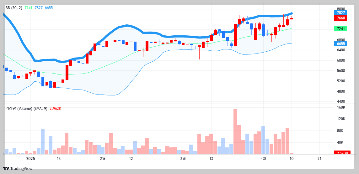 • 상단 밴드 접근 시: 단기 매도 고려 (과매수 상태 가능성)