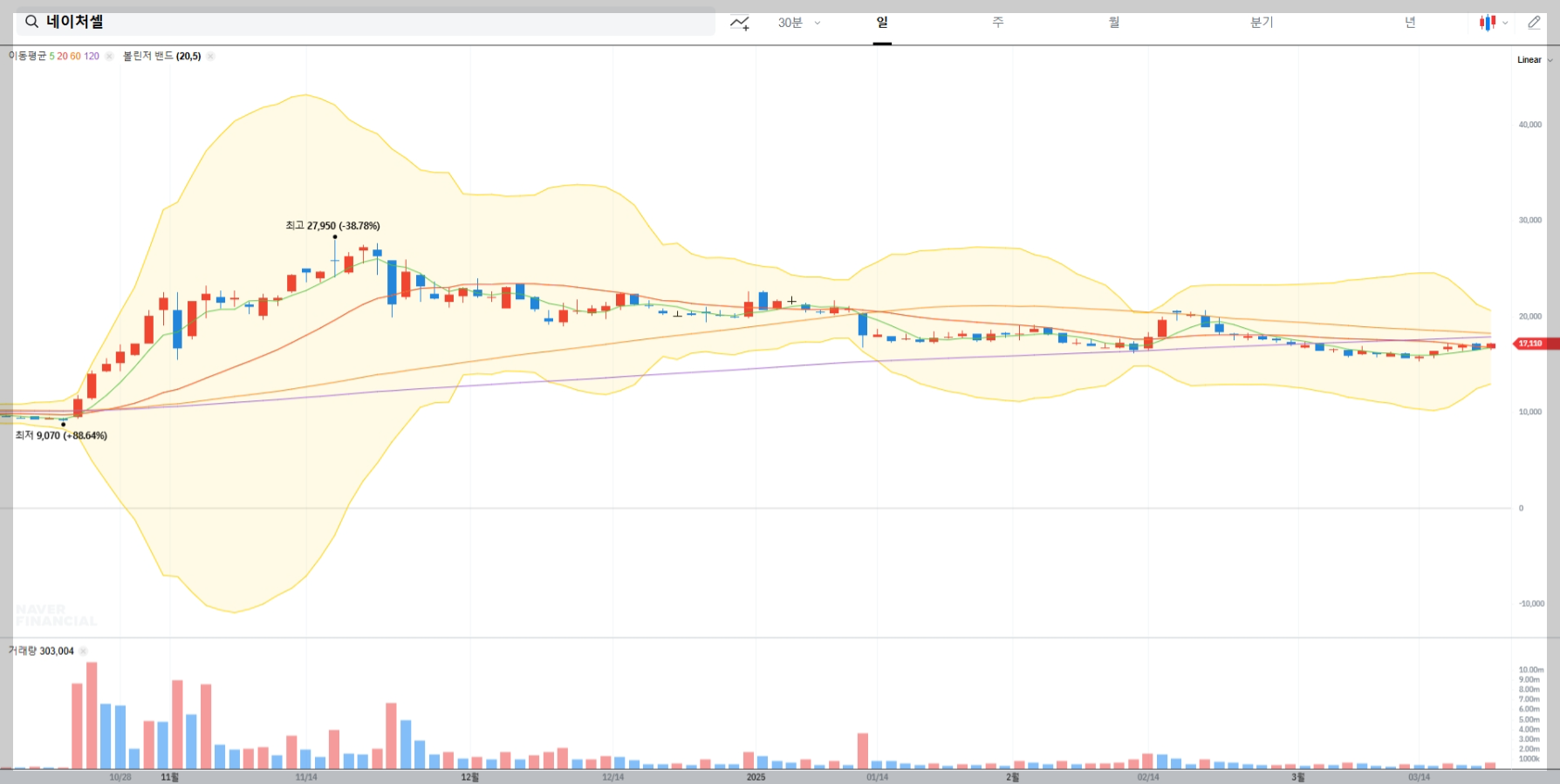 볼린저밴드 분석에 따르면 네이처셀의 최근 차트에서 밴드 폭이 좁아지는 '수렴' 현상이 관찰됩니다. 이는 변동성 축소 이후 급격한 추세 변화를 예고하며 상단 밴드를 돌파할 경우 추가 상승 가능성이 높아 보입니다.