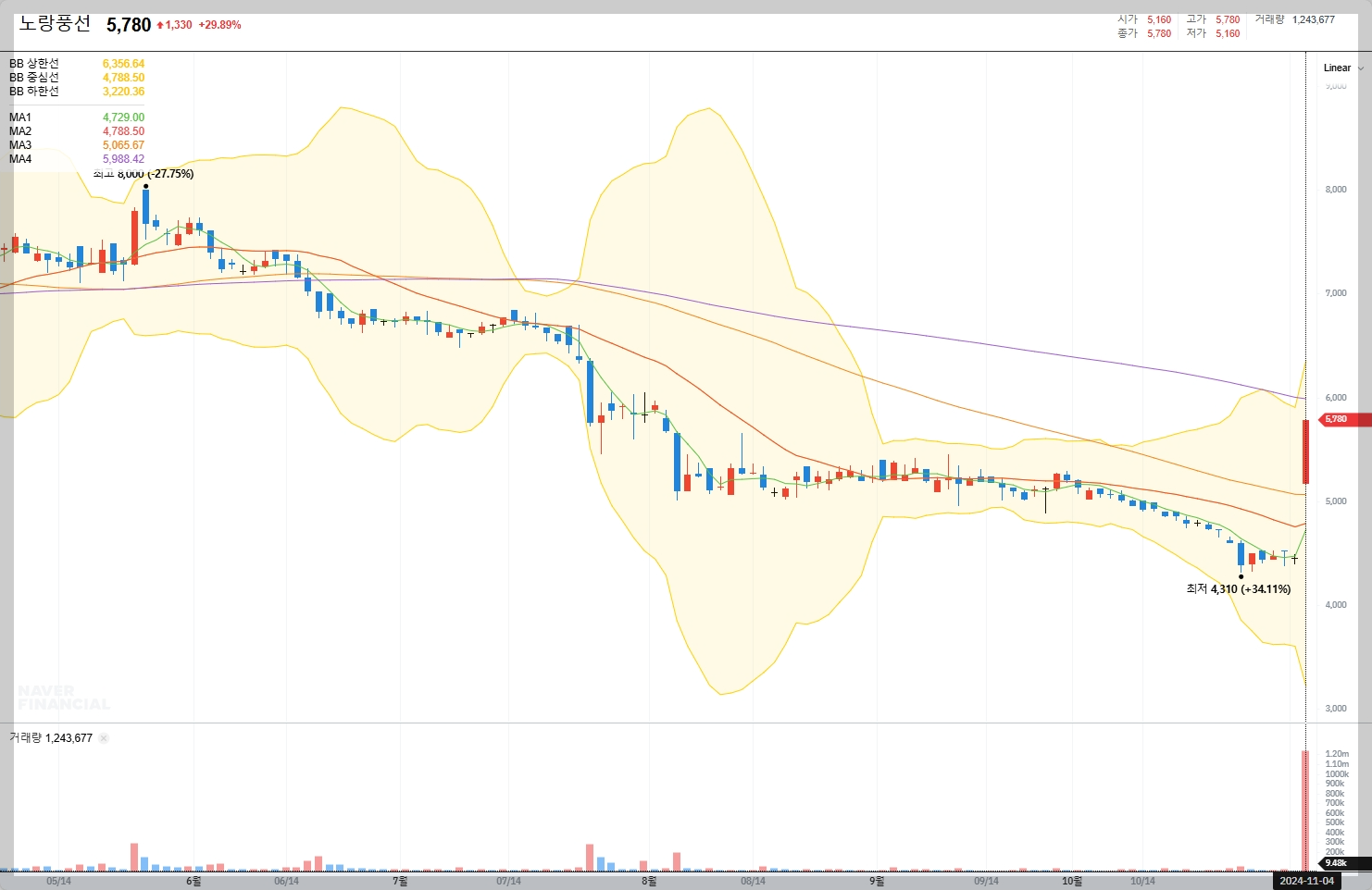 2024년 11월 4일 현재, 노랑풍선의 주식은 전 거래일에 비해 29.89% 오른 5,780원에 거래되고 있습니다.