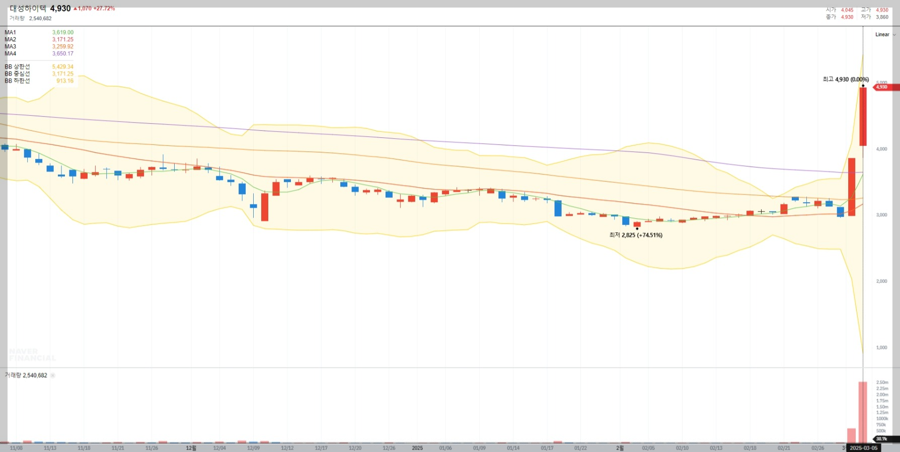 2025년 3월 5일 기준 대성하이텍의 종가는 4,930원으로 전일 대비 27.72% 상승했습니다. 거래량은 약 254만 주로 매우 활발한 움직임을 보였습니다.