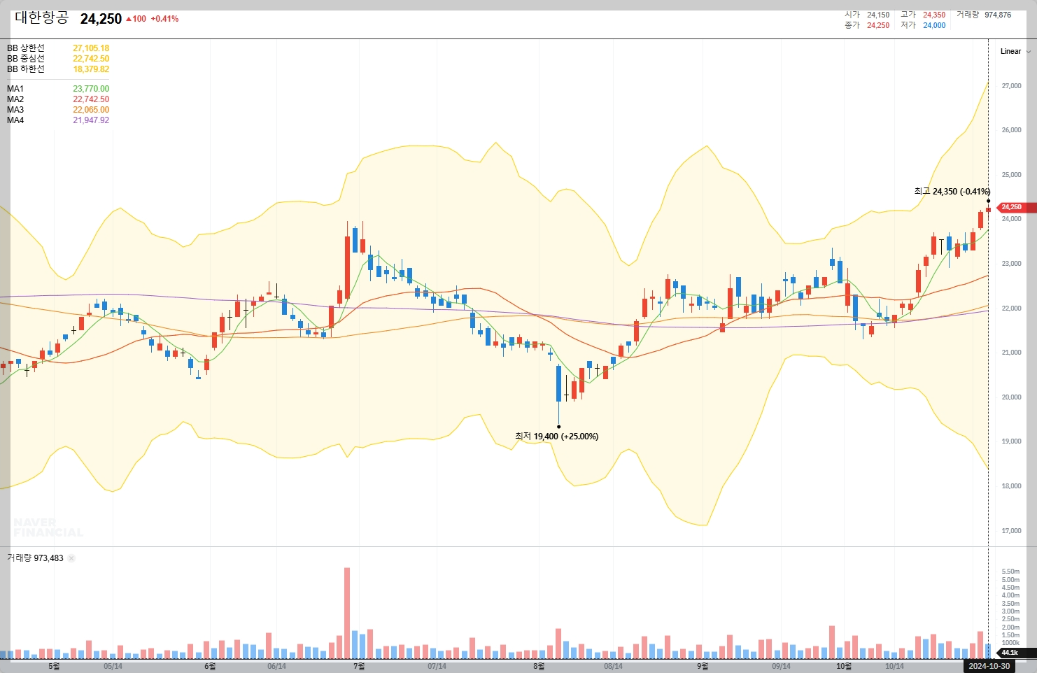 2024년 10월 30일 현재, 대한항공의 주가는 약 24,250원에 거래되고 있습니다. 이는 최근 몇 년 간의 주가 변동을 고려할 때 안정적인 수준으로 평가됩니다.