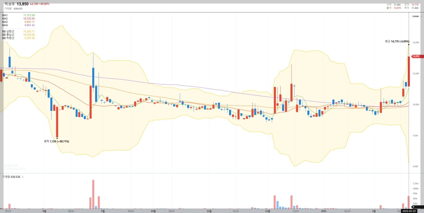 2025년 2월 19일 기준 덕성우의 주가는 13,850원으로 전일 대비 20.85% 상승했습니다. 최근 거래량 급증과 함께 기술적 반등이 나타나며 투자자들의 관심을 끌고 있습니다.