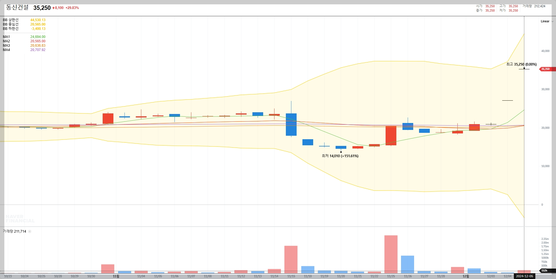 현재 동신건설의 주가는 35,250원으로 전일 대비 29.83% 상승했습니다. 이는 시장에서의 높은 변동성을 반영합니다.