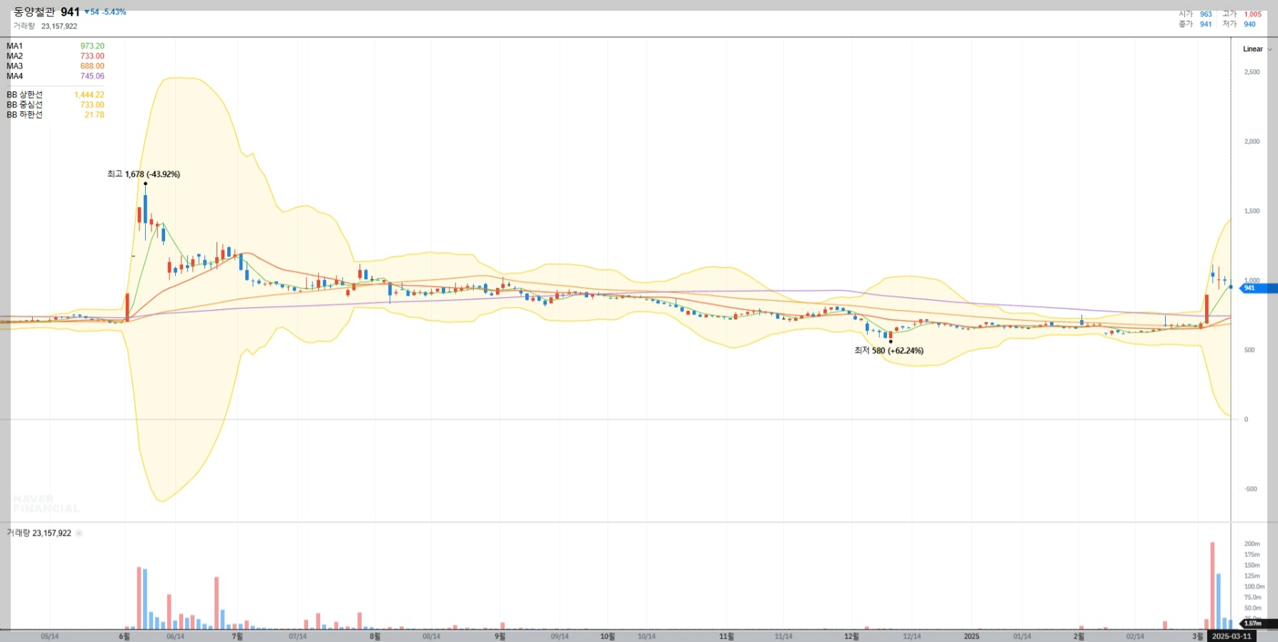 2025년 3월 기준 동양철관의 현재 주가는 941원으로 최근 변동성이 큰 모습을 보이고 있습니다. 특히 동해 석유·가스전 개발 관련 호재로 급등세를 보였습니다.