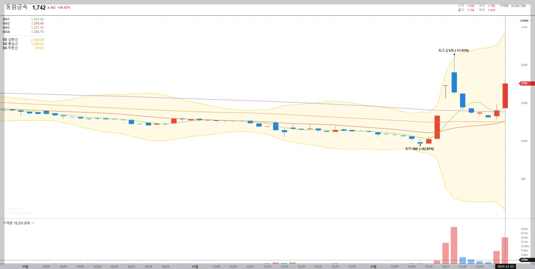 2024년 12월 23일 기준 동원금속의 종가는 1,742원으로 전일 대비 24.43% 상승했습니다. 이는 최근 거래량 급증과 함께 투자 심리가 개선된 결과로 보입니다. 특히 최저점인 960원에서 급반등 하며 단기적으로 강한 상승세를 보이고 있습니다.