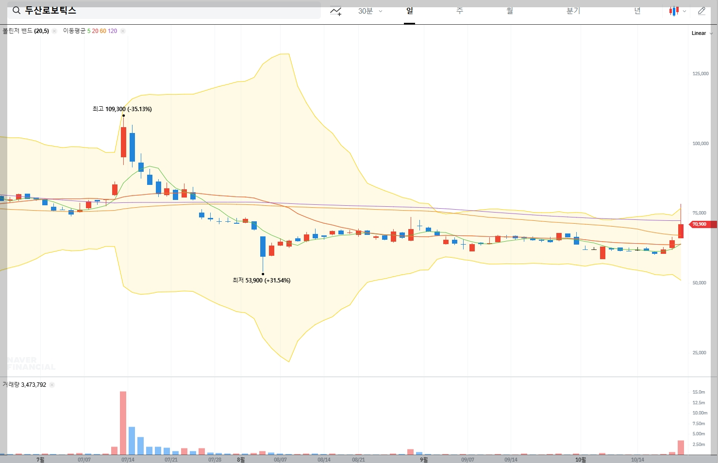 볼린저 밴드는 주식의 변동성을 측정하는 데 효과적인 도구입니다. 최근 두산로보틱스의 주가가 볼린저 밴드의 상단을 돌파하며 상승 추세를 나타내고 있습니다. 이는 매수 신호로 해석될 수 있습니다.