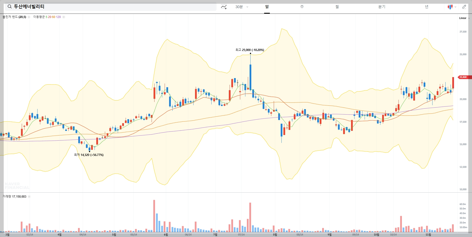 2024년 11월 기준 두산에너빌리티의 주가는 22,450원으로 기록되었습니다. 최근 몇 달간의 변동성을 보면 최저 14,320원에서 최고 25,000원까지 상승하며 약 56% 이상의 변동폭을 보였습니다. 이는 글로벌 에너지 시장의 변화와 두산에너빌리티의 사업 확장이 주요 요인으로 작용한 결과입니다.