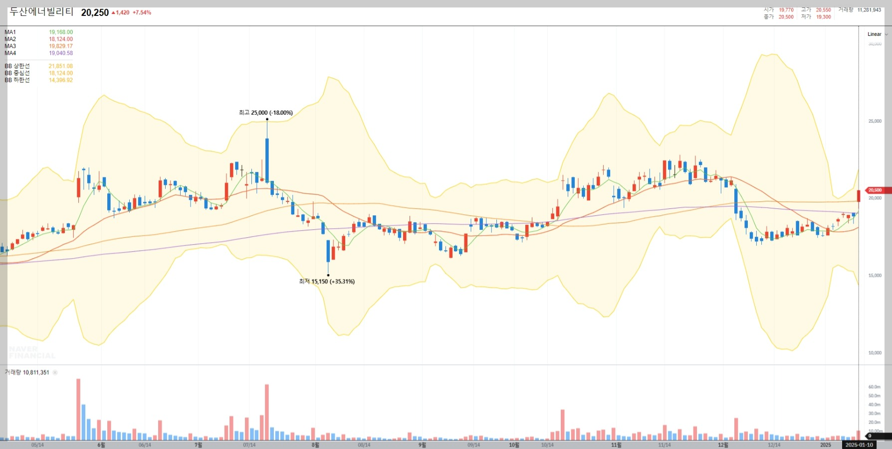 2025년 1월 10일 기준 두산에너빌리티의 현재가는 20,250원으로 전날 대비 7.54% 상승했습니다. 이는 최근 증권사들의 긍정적 리포트와 글로벌 원전 수요 증가 기대감이 반영된 결과로 보입니다.