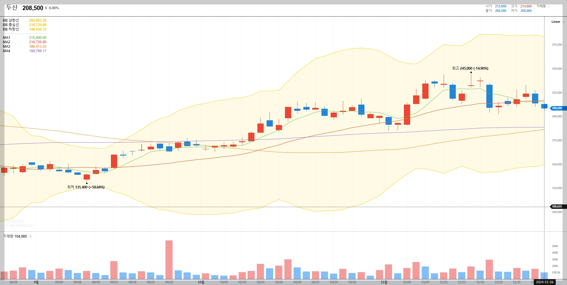 2024년 11월 26일 기준으로 두산의 현재 주가는 208,500원입니다. 최근 변동성을 고려할 때 안정적인 상승 흐름을 유지하고 있습니다.