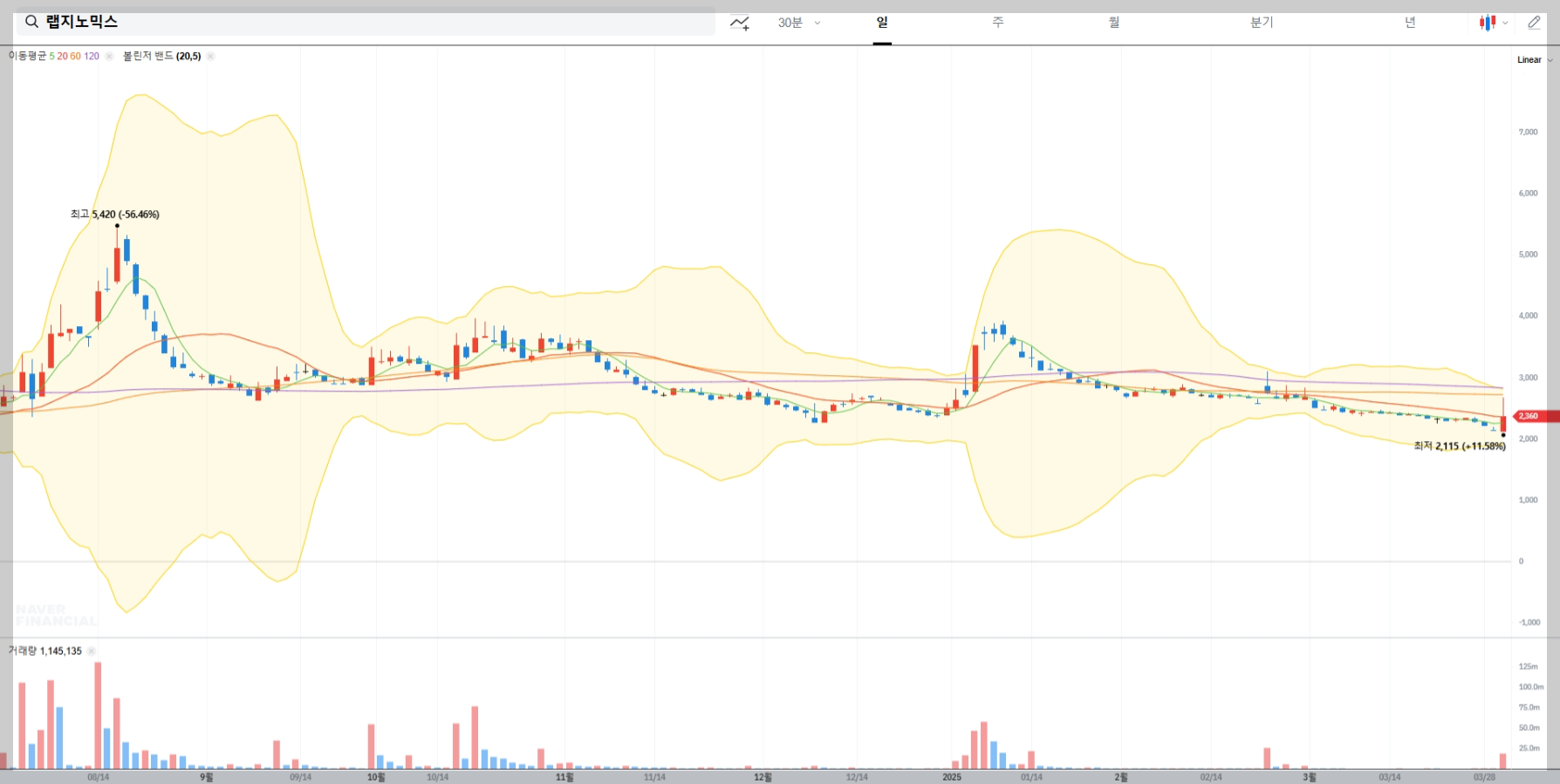 현재 랩지노믹스의 주가는 2,375원으로, 오늘 하루만 250원(11.76%) 상승했습니다. 이는 최근 바이오 섹터의 반등과 함께 회사의 긍정적인 실적 전망이 반영된 결과로 볼 수 있습니다. 거래량도 증가하며 투자자들의 관심이 높아지고 있습니다.