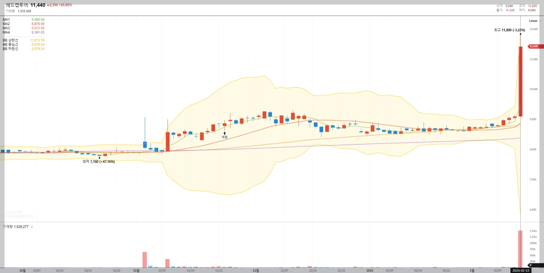 2025년 2월 13일 기준 레드캡투어의 현재 주가는 11,440원으로 전일 대비 25.85% 상승하며 강세를 보였습니다. 이는 단기적으로 투자자들의 강한 매수세가 반영된 결과로 볼 수 있습니다.