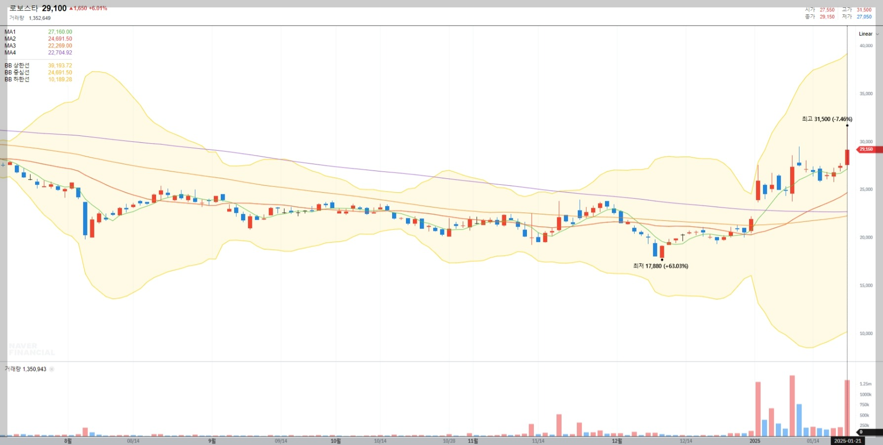 2025년 1월 21일 기준, 로보스타의 종가는 29,100원으로 전일 대비 6.01% 상승했습니다. 최근 거래량 증가와 함께 강세를 보이고 있습니다.