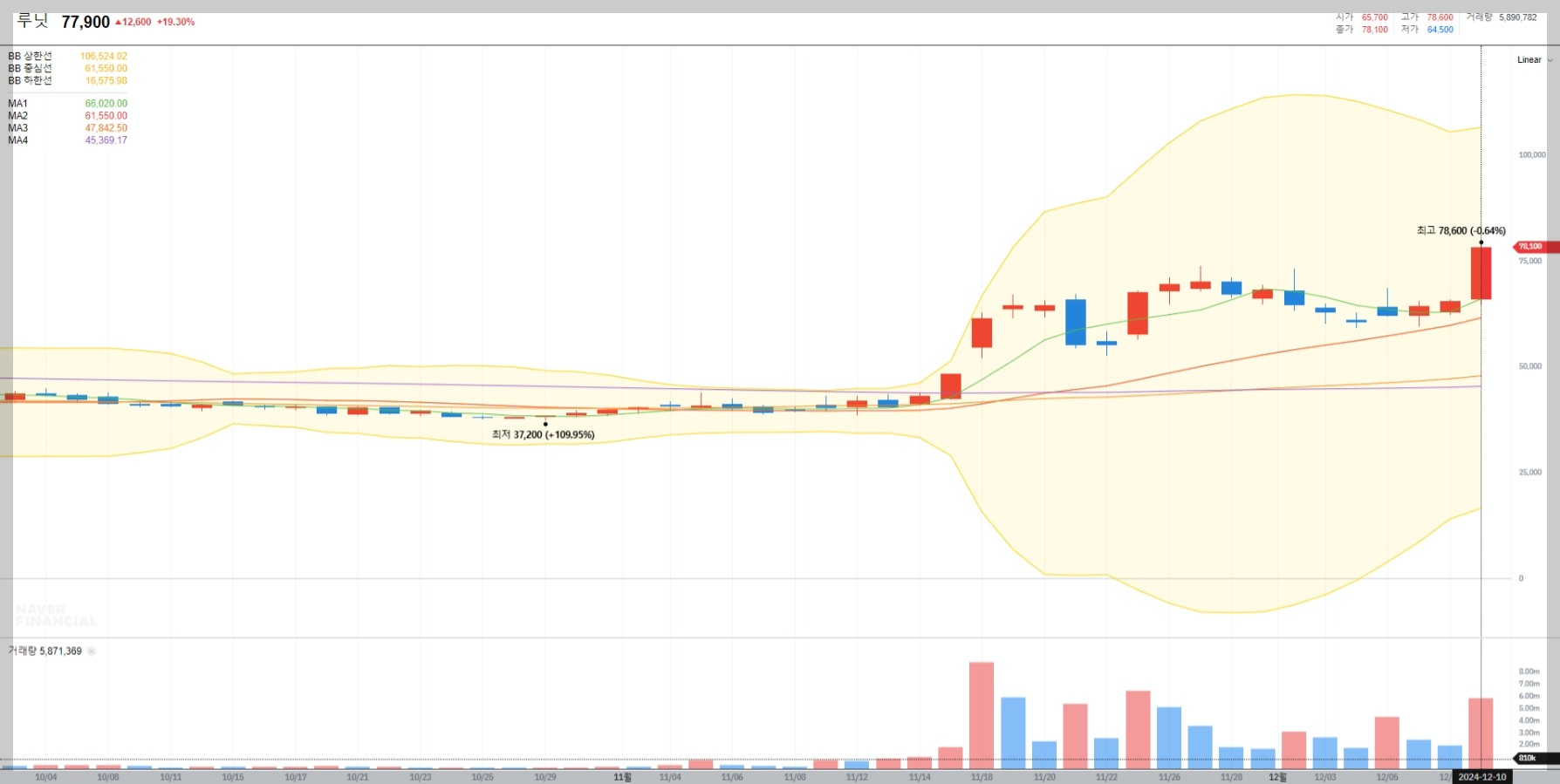 2024년 12월 10일 기준으로 루닛의 주가는 77,900원으로 전일 대비 19.30% 상승했습니다. 이는 최근 거래량 증가와 함께 강력한 매수세에 의해 상승세를 보이고 있음을 나타냅니다.