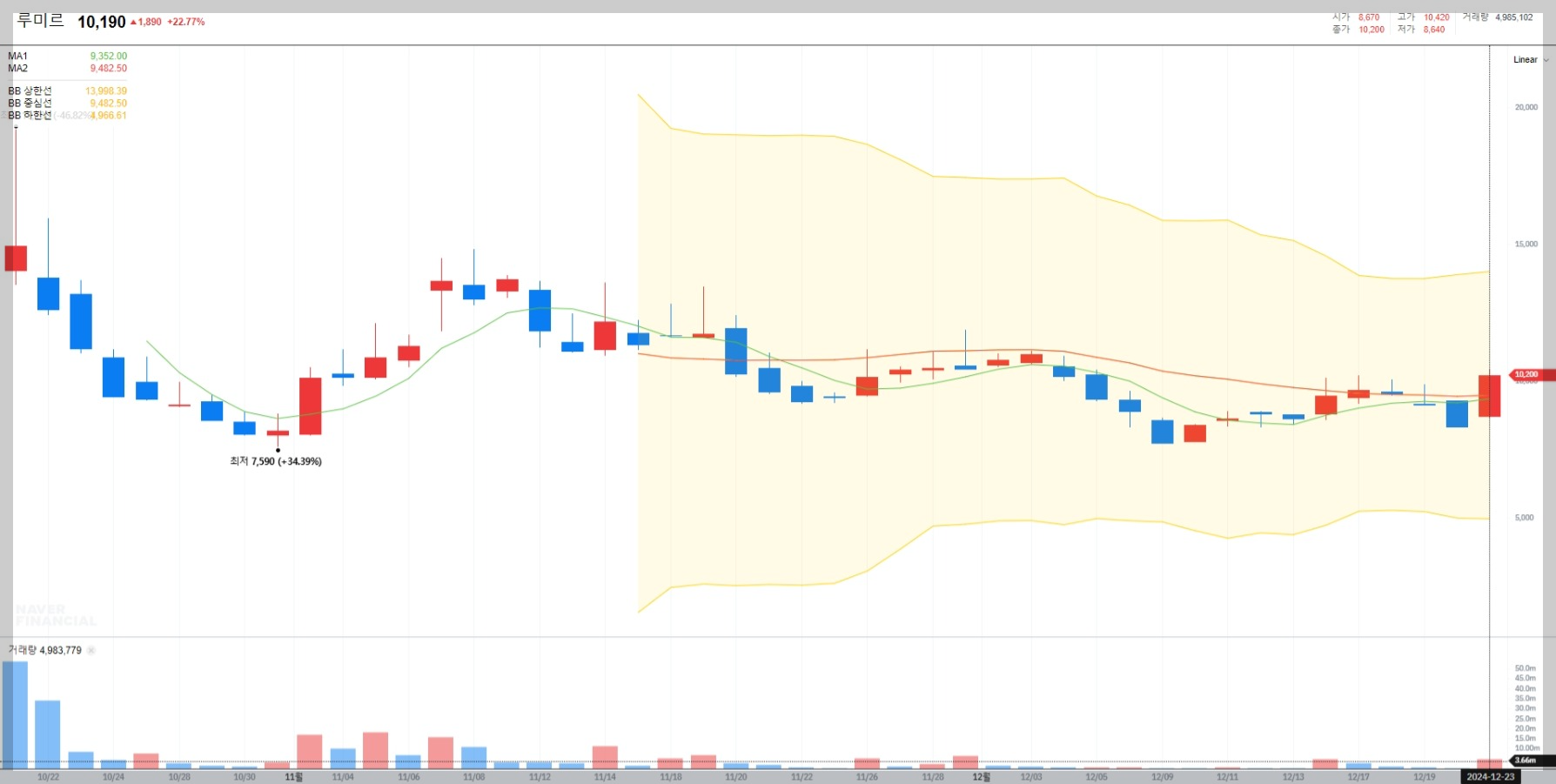 2024년 12월 23일 기준으로 루미르의 종가는 10,190원으로 전일 대비 22.77% 상승했습니다. 이는 단기적인 투자 심리 개선과 높은 거래량 증가에 따른 결과로 보입니다.