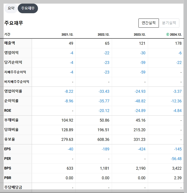 루미르의 최근 3년간 재무제표를 분석하면, 매출은 크게 증가하고 있으나 영업이익은 여전히 적자를 기록하고 있습니다. 그러나 2024년에 들어서 영업이익의 적자 폭이 상당히 감소하고 있는 것은 긍정적인 신호로 볼 수 있습니다.