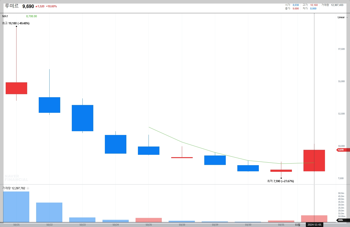 루미르의 주식 가격이 현재 9,690원으로, 18.60% 상승했습니다.