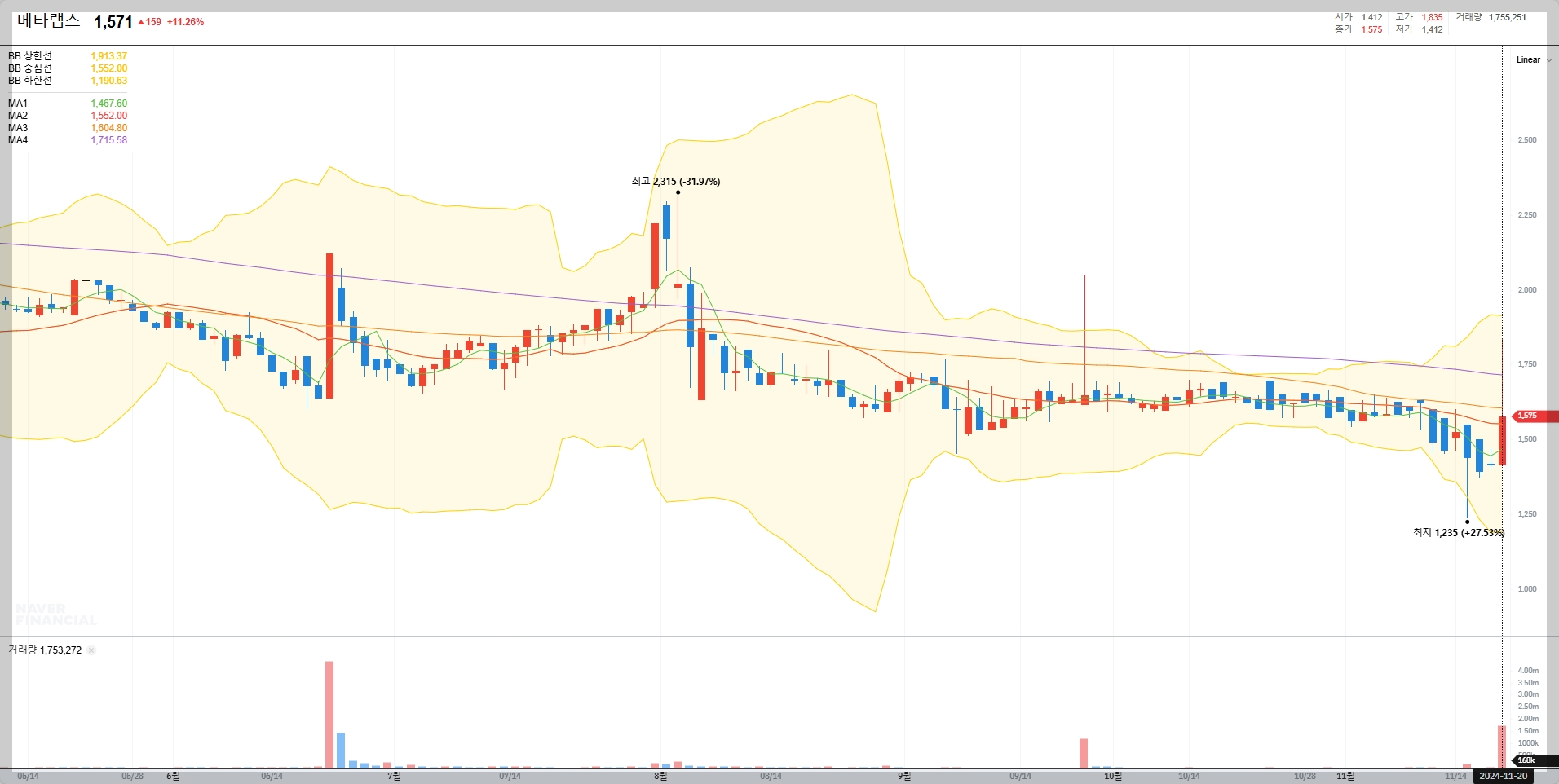 메타랩스의 현재 주가는 1,571원으로, 전일 대비 11.26% 상승하였습니다. 최근 몇 달 동안 변동성이 컸으며, 최고가는 2,315원(31.97%) 도달한 바 있습니다.
