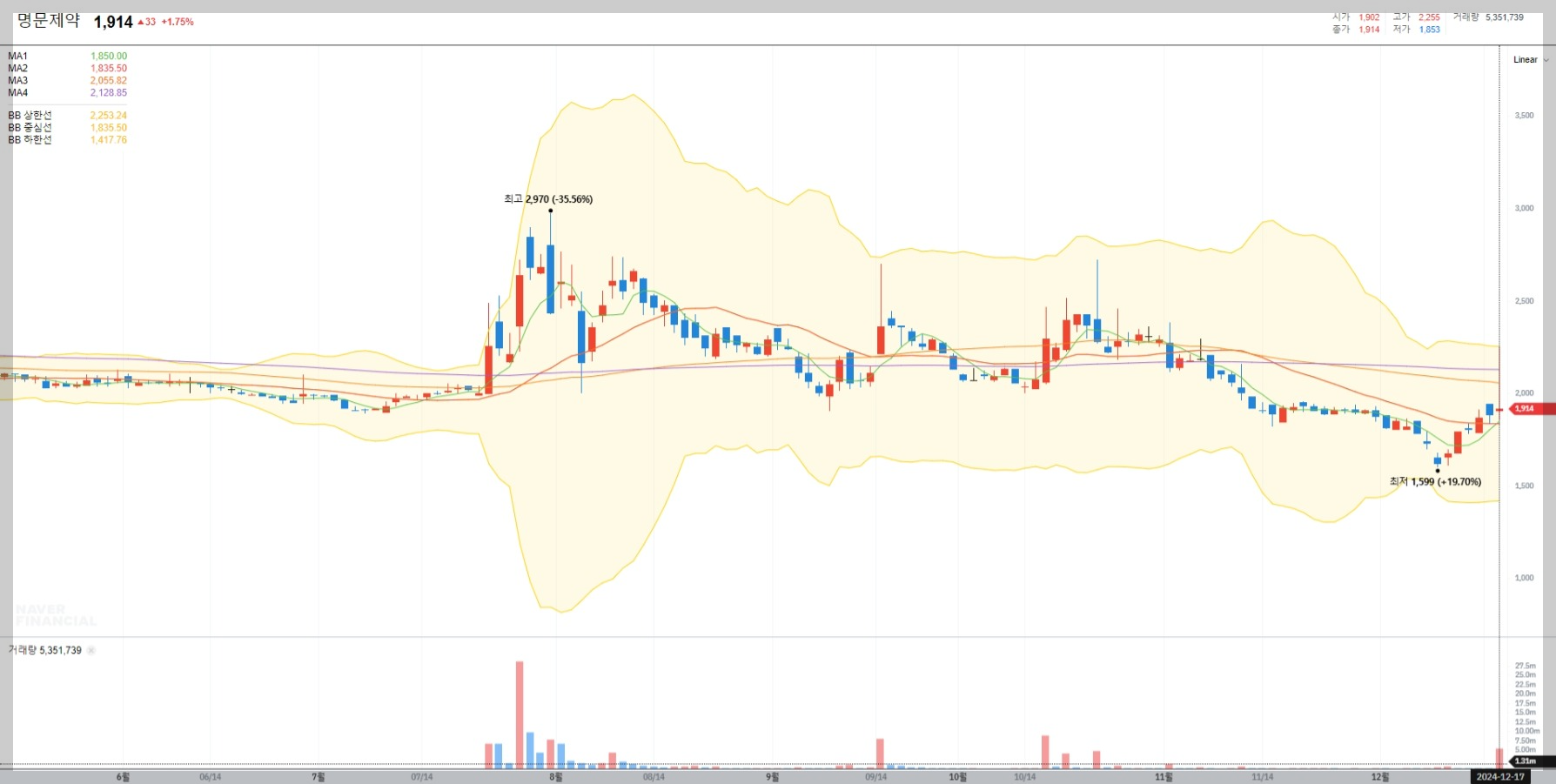 2024년 12월 17일 기준 명문제약의 종가는 1,914원으로 전일 대비 1.75% 상승했습니다. 최근 최저점인 1,599원 대비 약 19.7% 반등했으나 여전히 변동성이 큰 상황입니다.