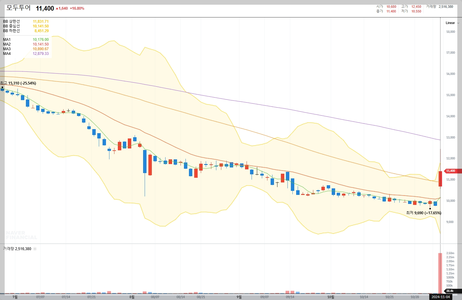2024년 11월 4일 기준, 모두투어의 주가가 11,400원으로 16.80% 상승하였습니다.