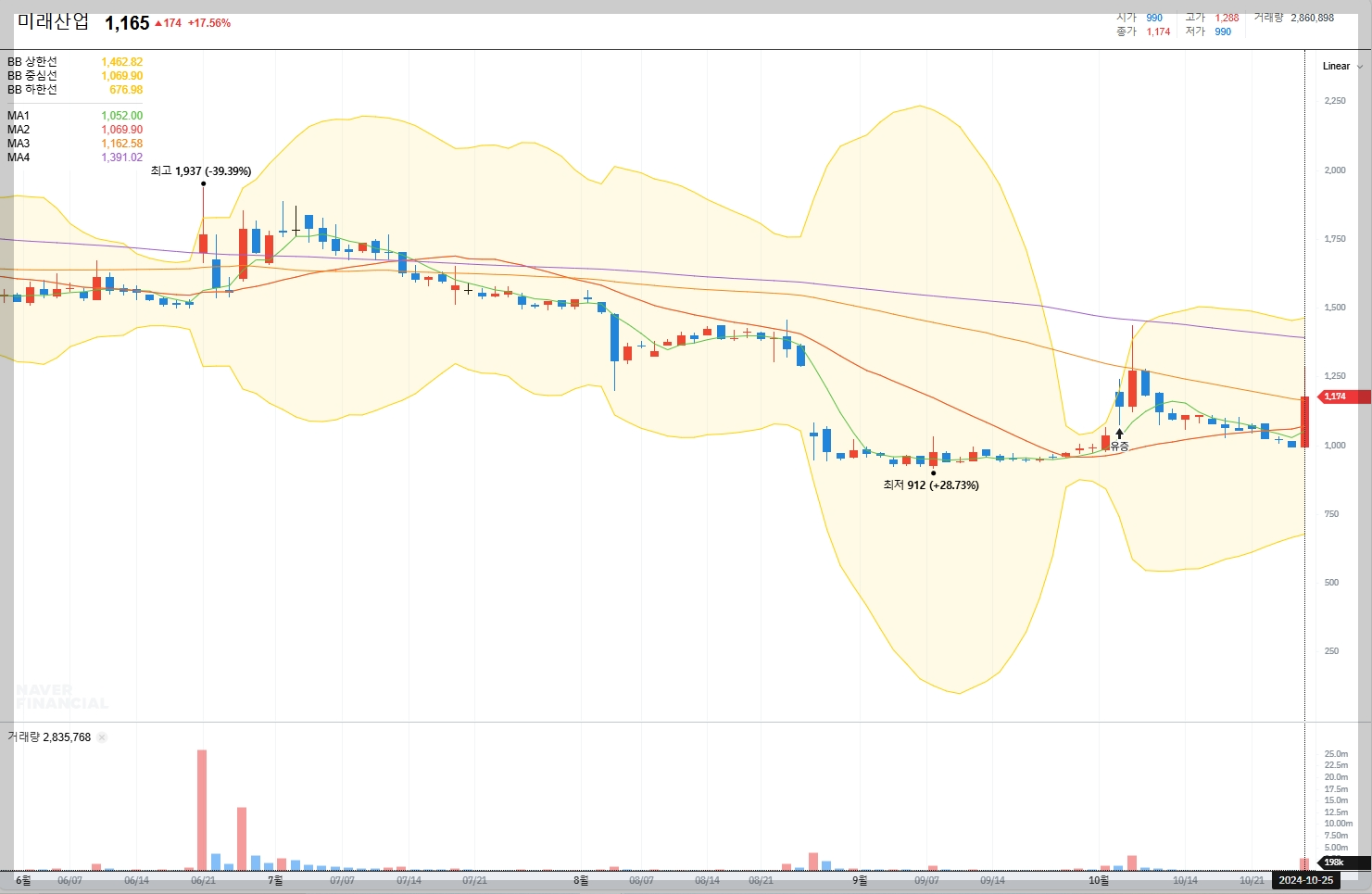 2024년 10월 24일 기준으로 미래산업의 주가는 1,165원입니다. 최근 주가는 52주 최저치인 913원에서 반등하여 현재 수준에 도달했습니다.