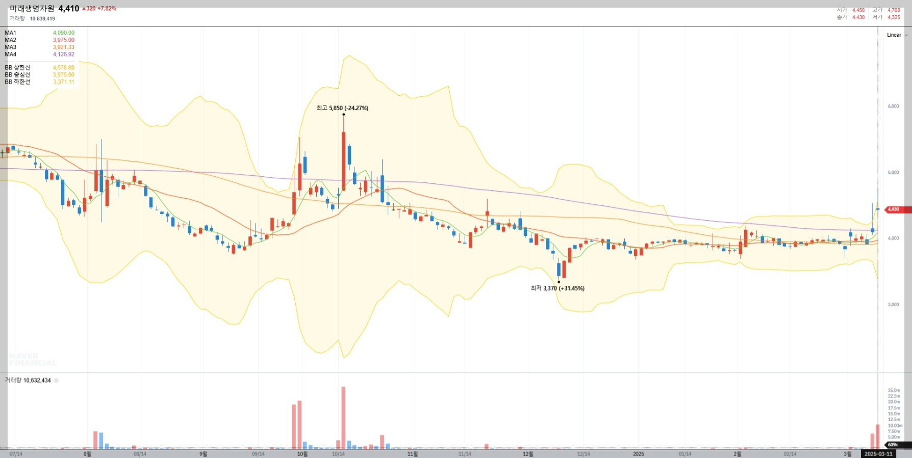 2025년 3월 11일 기준 미래생명자원의 주가는 4,410원으로 전일 대비 7.82% 상승 중입니다. 거래량은 약 1천만 주 이상으로 급증하며 투자자들의 관심이 집중되고 있습니다.