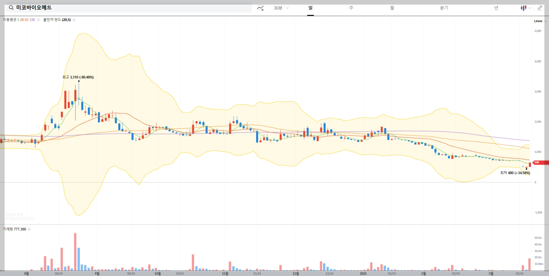 볼린저밴드는 주식의 변동성을 기반으로 매매 타점을 찾는 기술적 분석 도구입니다. 미코바이오메드의 최근 상승세를 고려할 때 볼린저밴드 상단 돌파 시 매도 타점 설정과 하단 접근 시 매수 전략을 활용할 수 있습니다.