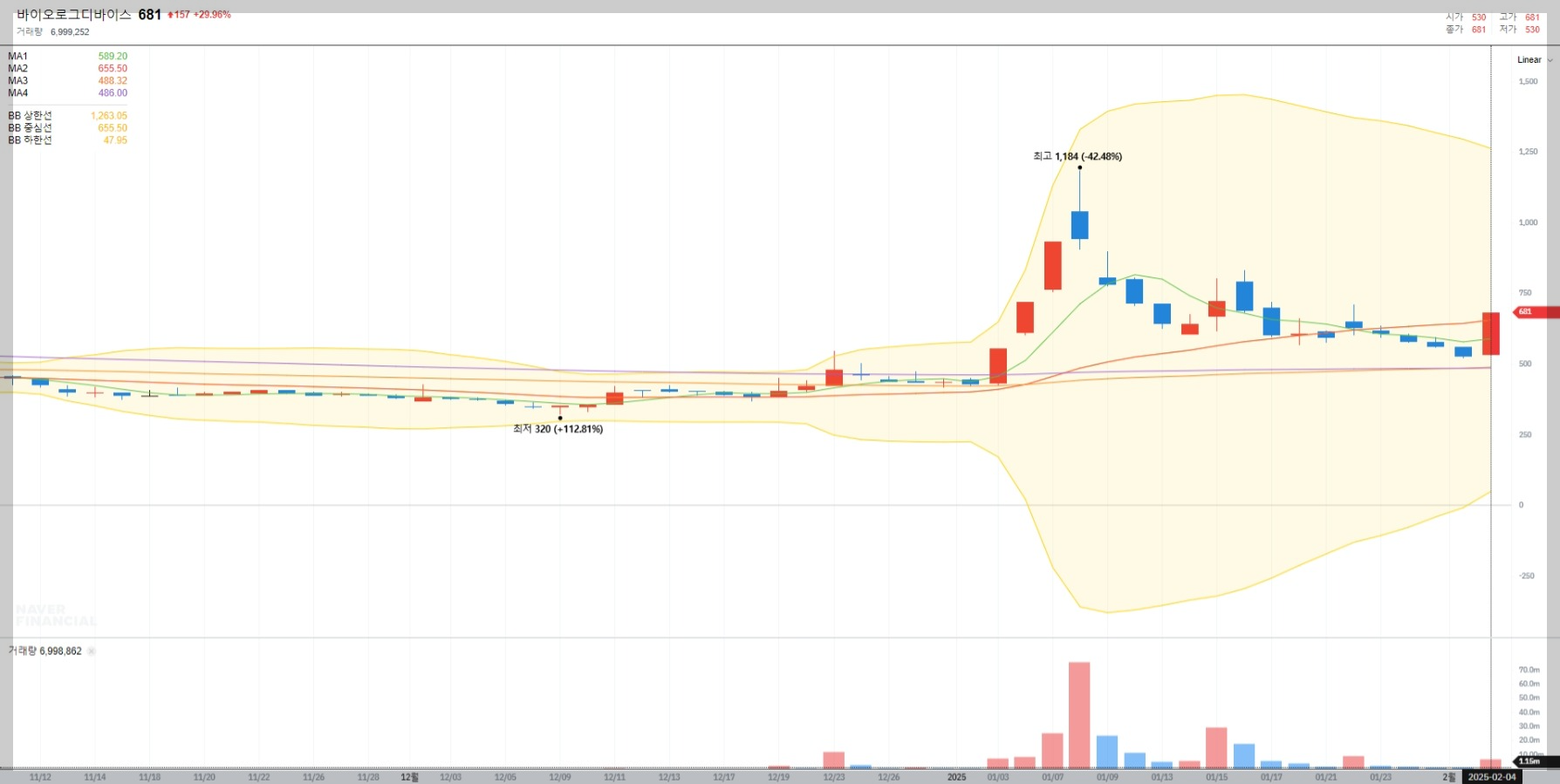 현재 바이오로그디바이스의 주가는 681원으로 전일 대비 29.96% 상승했습니다. 거래량은 약 7백만 주에 달하며, 이는 시장에서의 높은 관심을 반영합니다. 하지만 단기 급등 이후 조정 가능성도 염두에 두어야 합니다.