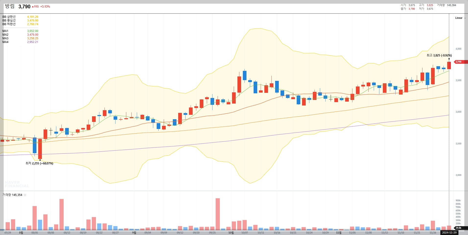 볼린저밴드는 통계적 변동성을 기반으로 한 기술적 분석 도구로, 방림의 최근 주가는 상단 밴드를 돌파하며 강한 상승세를 보여주고 있습니다. 이는 추가적인 상승 가능성을 시사합니다.