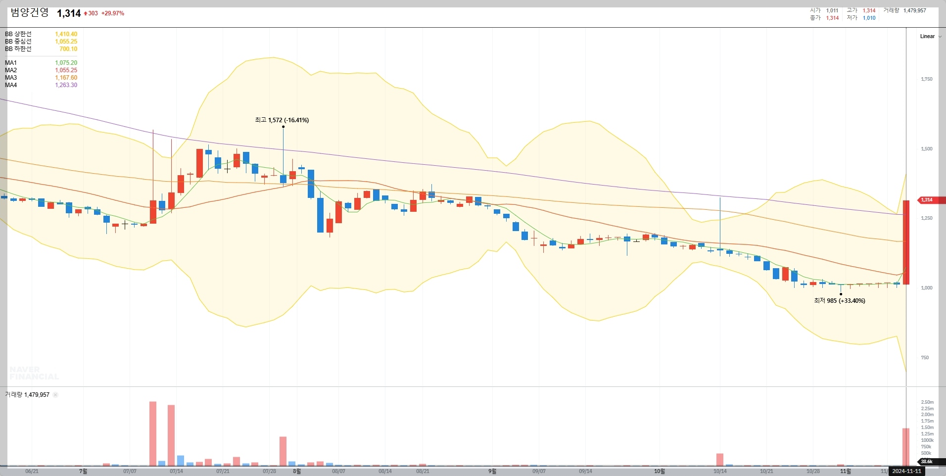 2024년 11월 11일 현재, 범양건영의 주가는 1,314원이며, 대규모 계약 체결 발표에도 불구하고 전일 대비 약간의 하락세를 나타내고 있습니다.