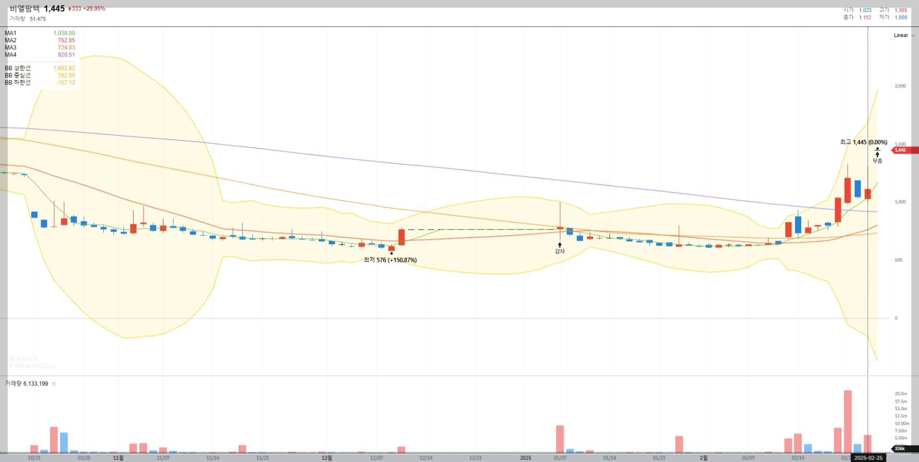 2025년 2월 26일 기준 비엘팜텍의 주가는 1,445원으로 전일 대비 29.95% 상승했습니다. 이는 최근 거래량 증가와 함께 강한 매수세가 유입된 결과로 보입니다.
