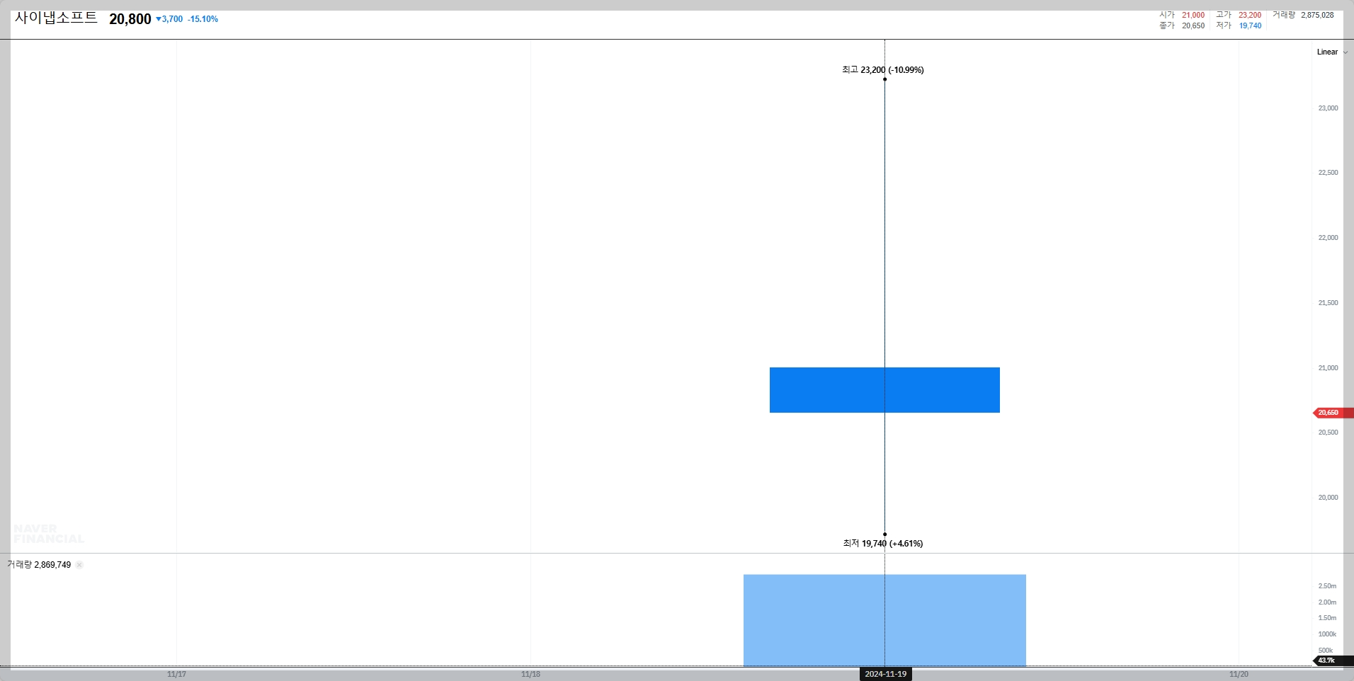 2024년 11월 19일 기준으로 사이냅소프트의 주가는 20,800원에 거래되고 있으며, 전일 대비 15.10% 하락한 모습을 보이고 있습니다. 상장 첫날부터 변동성이 큰 모습을 보이며 투자자들의 관심을 끌고 있습니다.