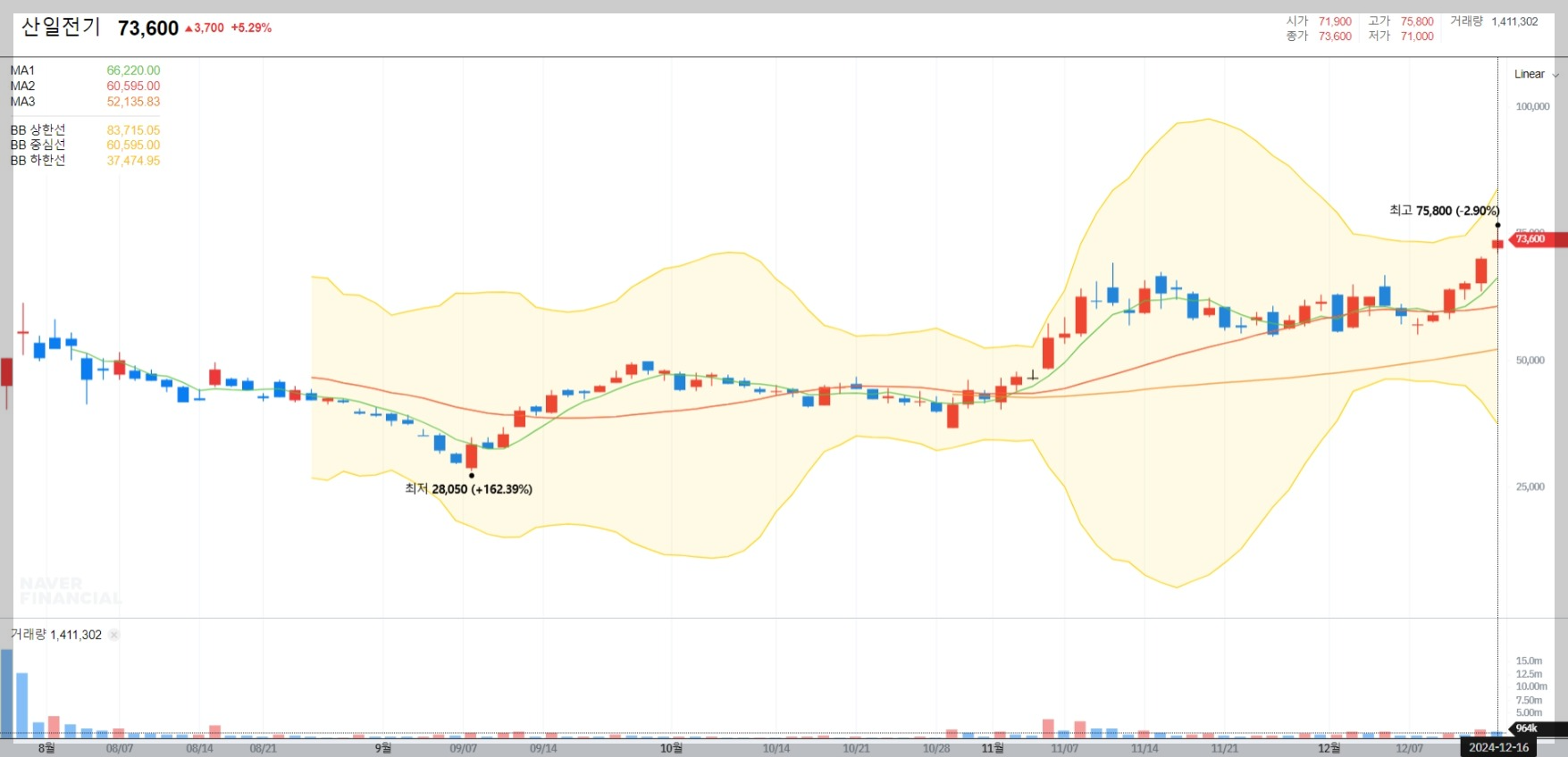 2024년 12월 16일 기준 산일전기의 종가는 73,600원으로 전일 대비 5.29% 상승했습니다. 최근 상승세는 볼린저밴드 상단 돌파와 함께 강한 매수세를 동반하며 지속되고 있습니다.