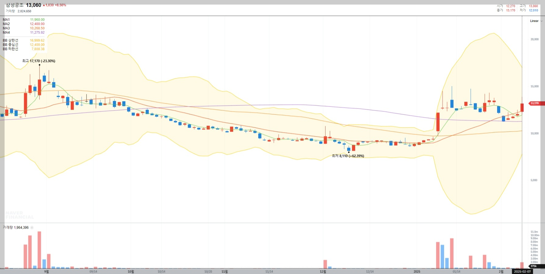 볼린저밴드 차트를 분석해 보면 삼성공조의 최근 주가는 상단 밴드에 근접하며 강세 흐름을 보이고 있습니다. 이는 단기적으로 과매수 구간에 진입했음을 시사하지만, 거래량 증가와 함께 추가 상승 가능성도 열려 있습니다.