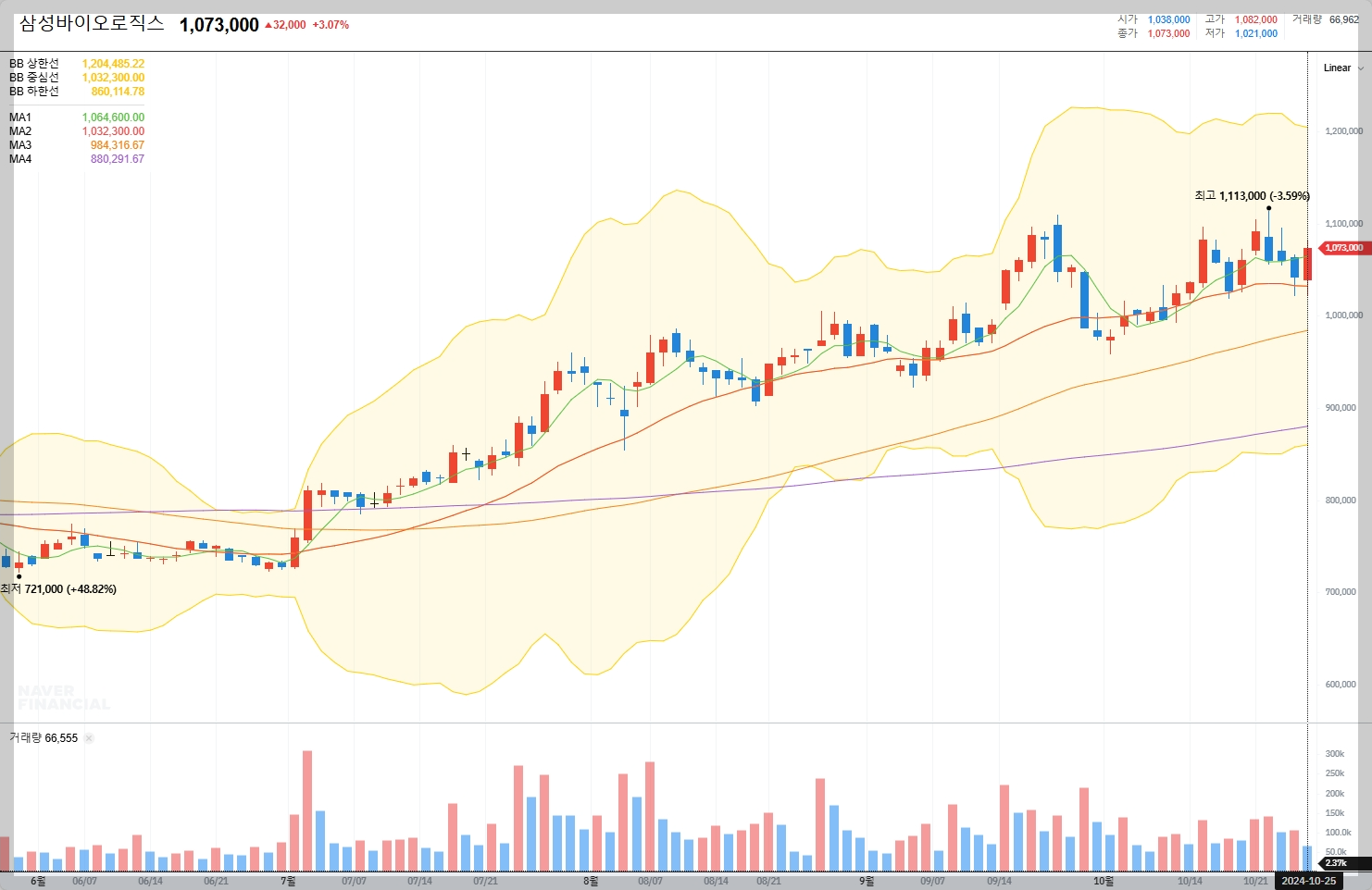 2024년 10월 24일 현재, 삼성바이오로직스의 주가는 1,073,000원입니다. 이는 신규 실적 발표와 목표 주가의 상향 조정에 기인한 것입니다.