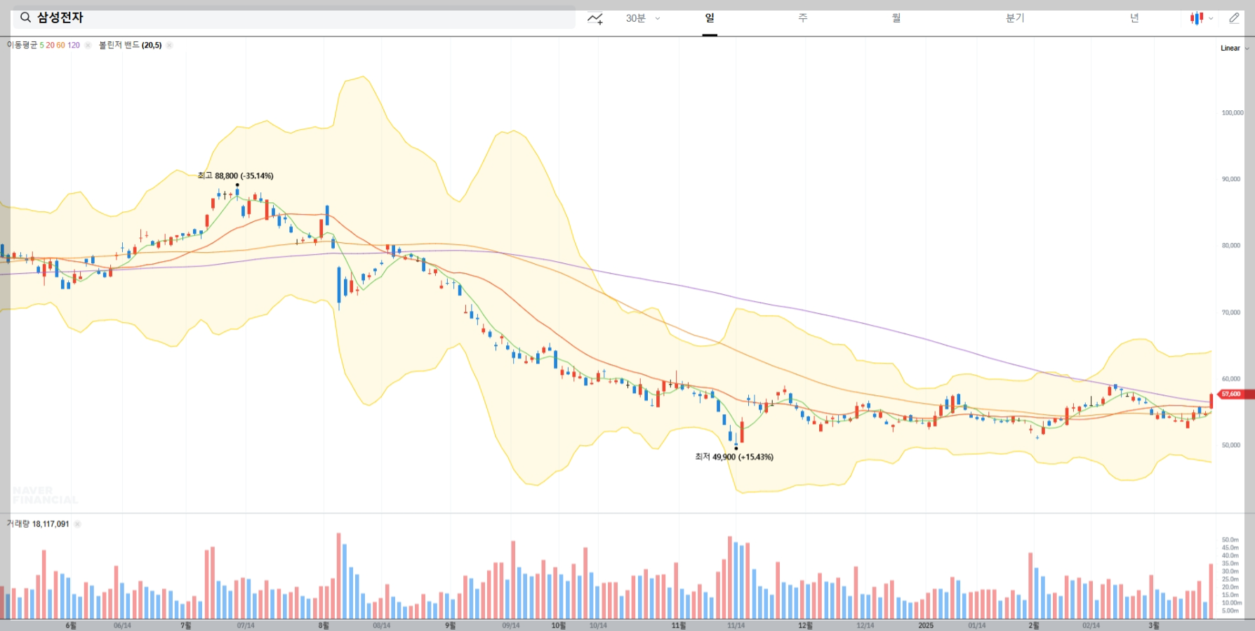 볼린저밴드 매매기법을 활용하면 삼성전자의 단기적인 변동성을 분석할 수 있습니다. 현재 삼성전자는 상단 밴드 근처에서 거래되고 있어 과매수 상태일 가능성이 있습니다. 따라서 추가 상승 여력은 제한적일 수 있으며, 조정 국면 진입 가능성을 염두에 두어야 합니다.