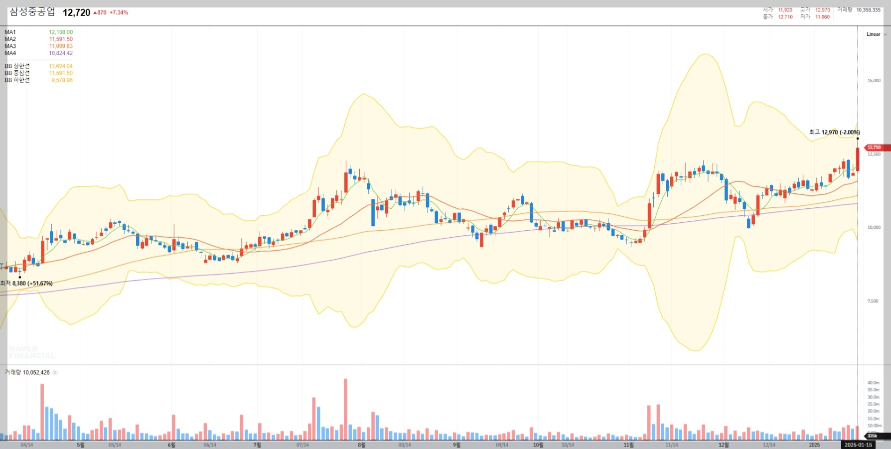 2025년 1월 15일 기준 삼성중공업의 주가는 12,720원으로 최근 상승세를 보이고 있습니다. KB증권은 목표주가를 14,500원으로 제시하며 추가 상승 여력을 전망하고 있습니다.