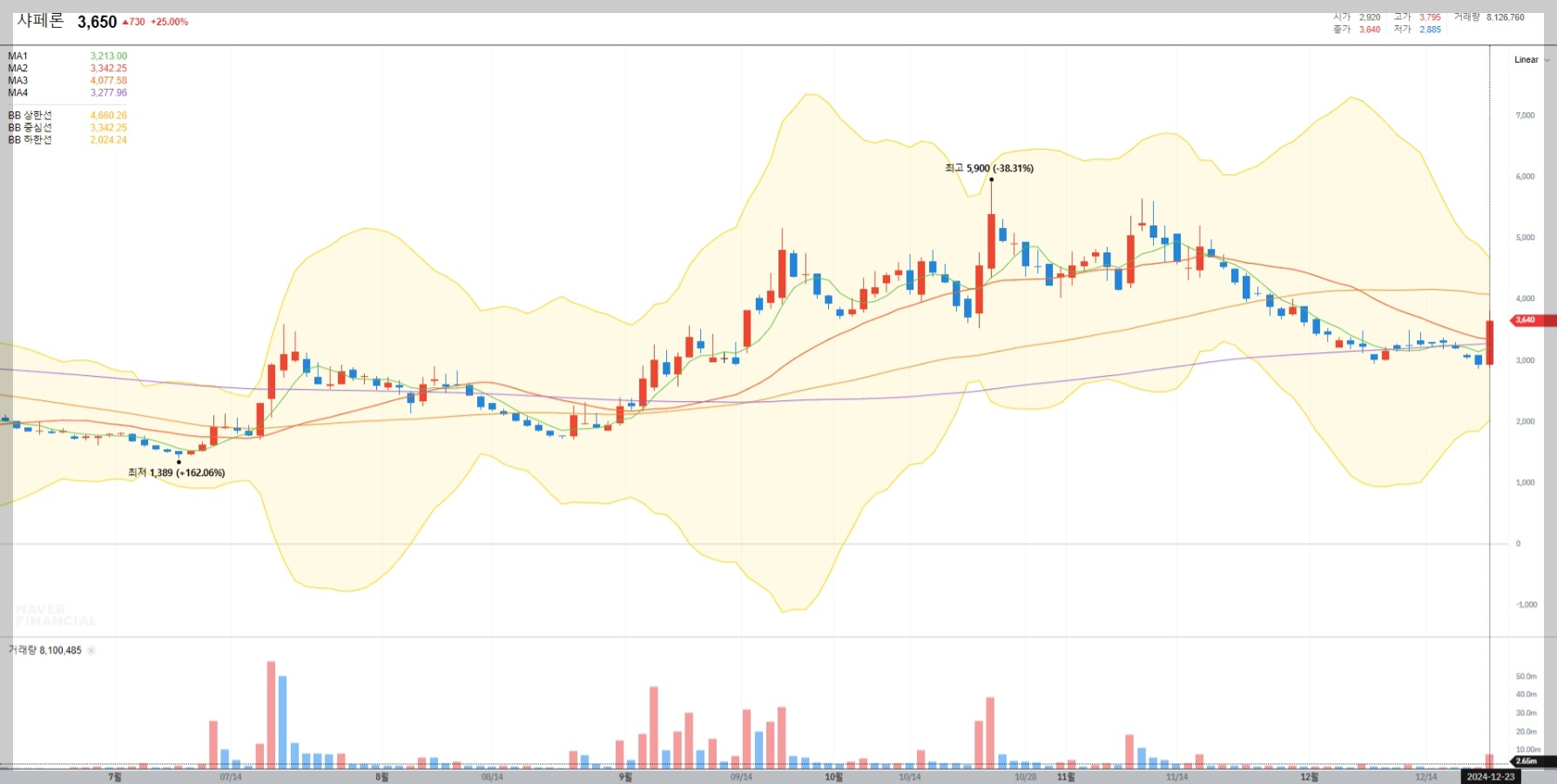 2024년 12월 23일 기준 샤페론의 주가는 3,650원으로 전일 대비 25% 상승했습니다. 이는 최근 하락세에서 반등을 시도하는 움직임으로 볼 수 있습니다. 볼린저밴드 상단선을 돌파하며 강한 매수세를 보이고 있습니다.