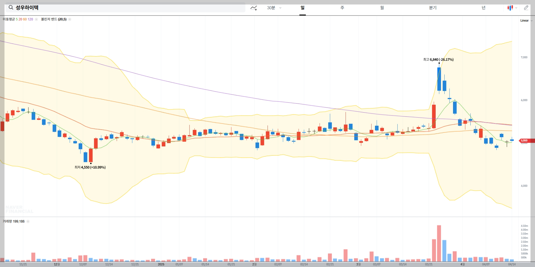 2025년 4월 15일 현재 성우하이텍의 주가는 5,050원이며, 장 전 거래에서는 5,840원까지 상승하며 15.64%의 상승세를 보이고 있습니다. 최근 주가는 4,885원에서 5,250원 사이에서 정체되어 있었으나, 기관의 매수세와 외국인의 매도압력이 복합적으로 작용하고 있는 상황입니다.