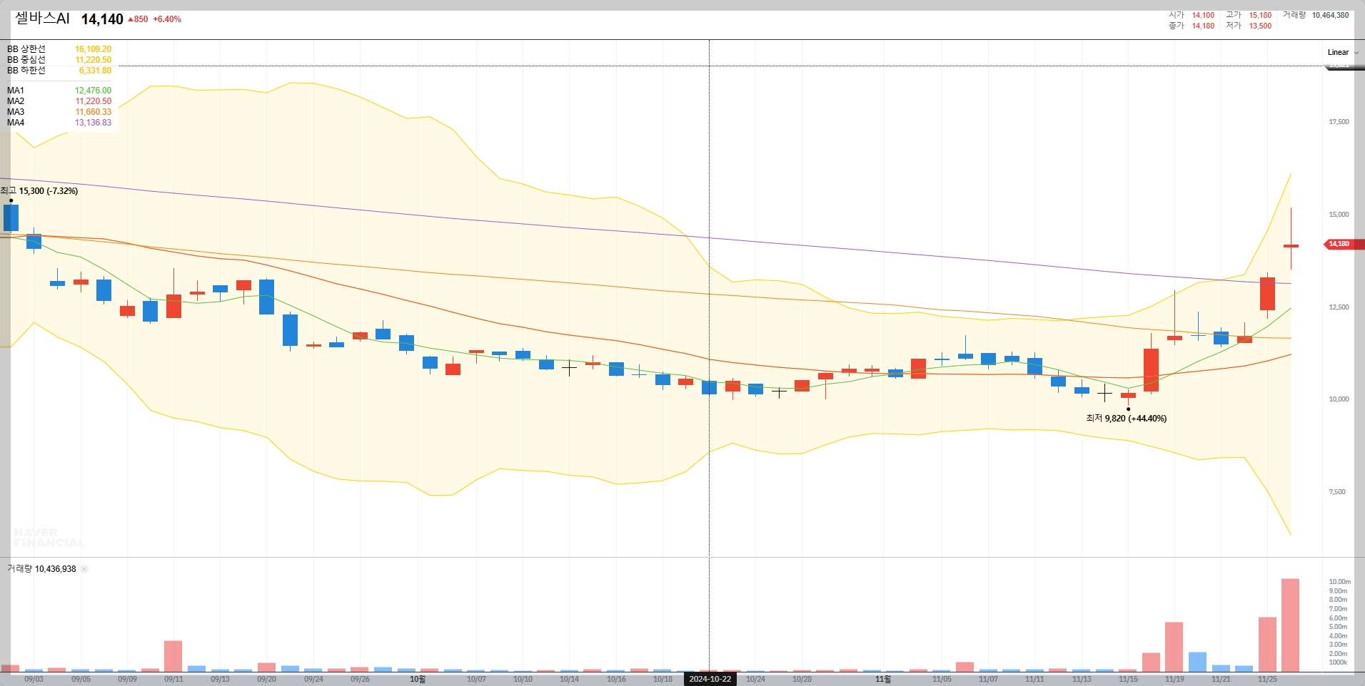 2024년 11월 26일 기준 셀바스AI의 주가는 14,140원으로 전일 대비 6.4% 상승했습니다. 최근 AI 테마주로 분류되며 강한 모멘텀을 보이고 있습니다.