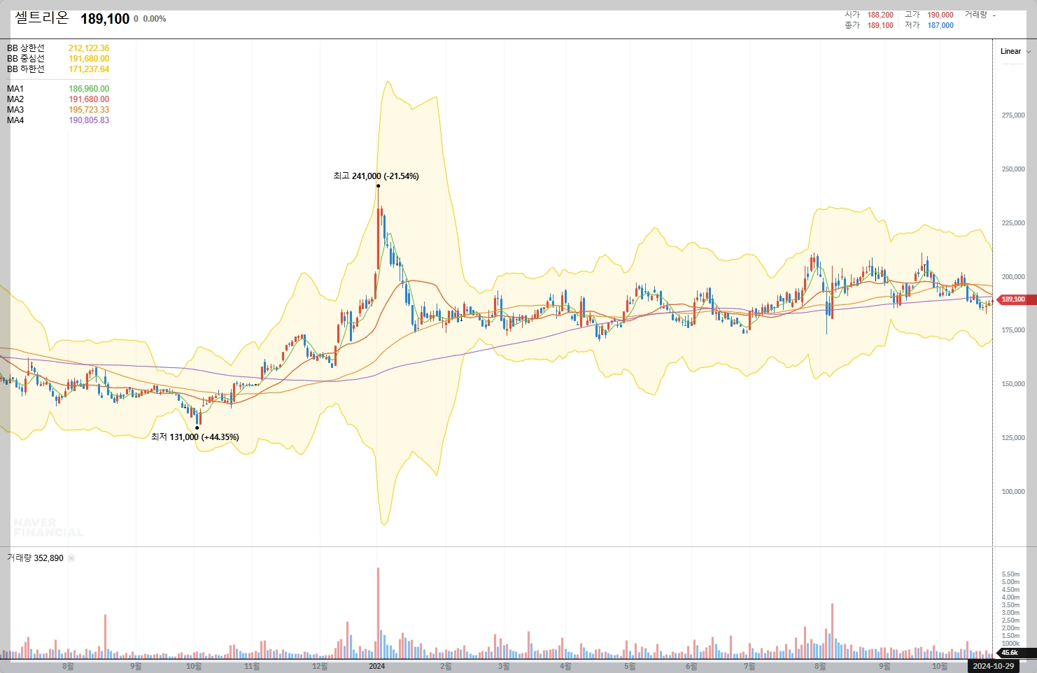 2024년 10월 30일 현재, 셀트리온의 주가는 189,100원입니다. 최근에는 실적 호조와 자사주 소각과 같은 긍정적인 소식에 힘입어 주가가 상승하고 있습니다.