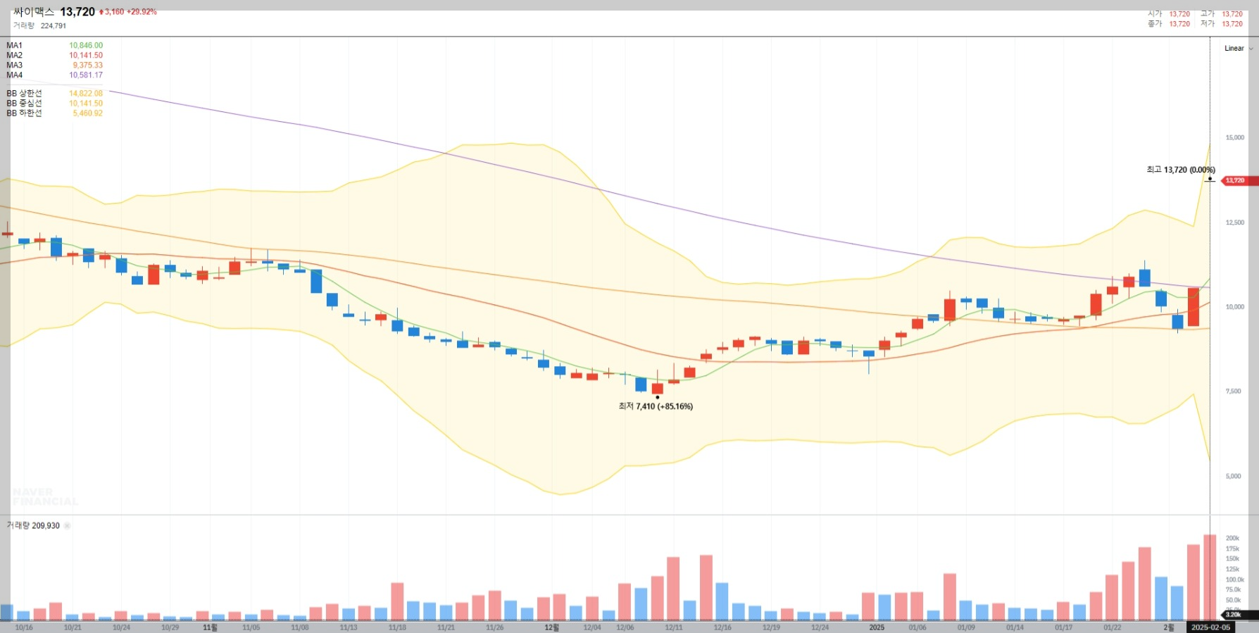 2025년 2월 5일 기준으로 싸이맥스의 현재 주가는 13,720원입니다. 최근 몇 달간 하락세를 보였으나 저점인 7,410원에서 반등하며 강한 상승세를 기록하고 있습니다. 거래량 증가와 함께 기술적 지표에서도 긍정적인 신호가 나타나고 있습니다.
