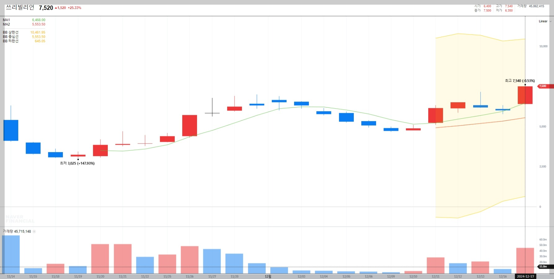 2024년 12월 17일 기준 쓰리빌리언의 주가는 7,520원으로 전일 대비 25.33% 상승했습니다. 이는 공모가(4,500원) 대비 크게 오른 수치로, 상장 초기부터 높은 투자자 관심을 받고 있습니다.