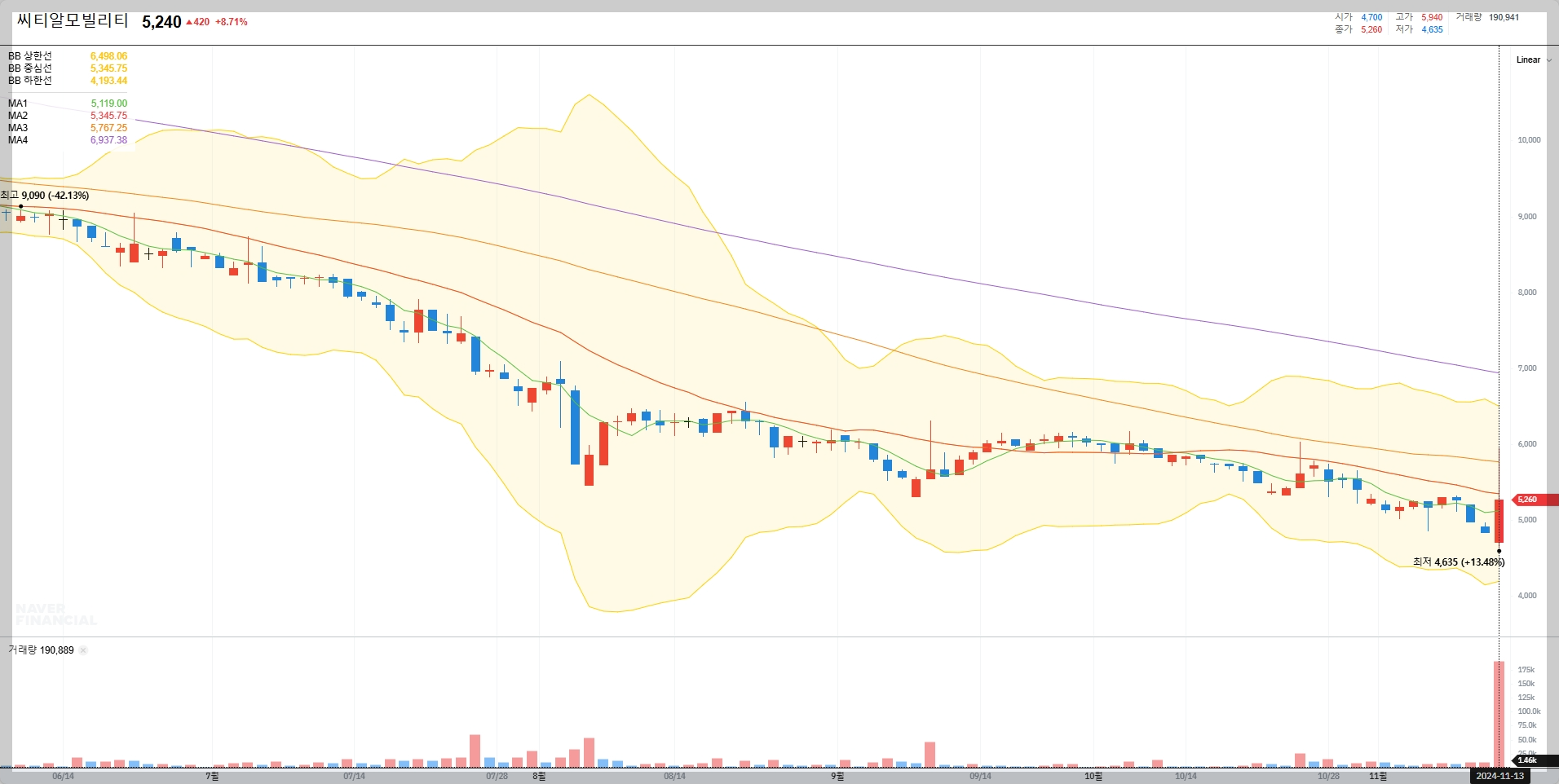2024년 11월 기준 씨티알모빌리티의 주가는 5,240원으로, 최근 하락세를 보이고 있습니다. 이는 전일 대비 약 8.71% 하락한 수치입니다. 주가는 최근 몇 달간 지속적인 하락세를 보였으며, 이는 재무적 성과 악화와 글로벌 경제 불확실성에 기인한 것으로 보입니다.