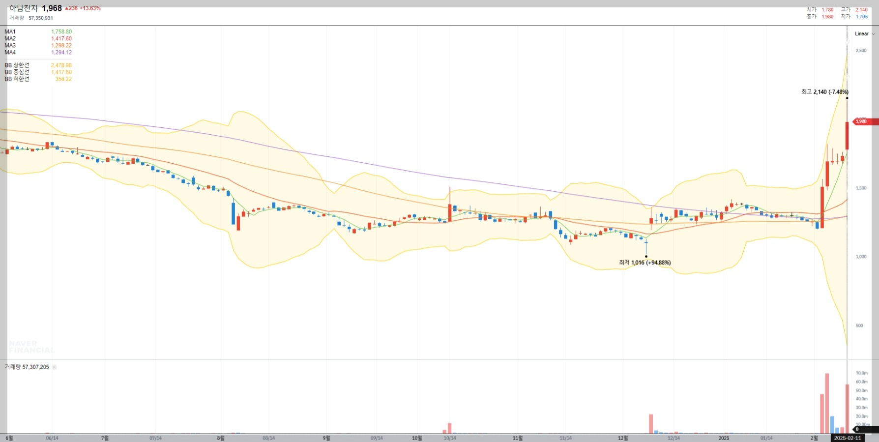 2025년 2월 11일 기준 아남전자의 주가는 1,968원으로 전일 대비 13.63% 상승했습니다. 최근 거래량이 급증하며 강한 상승세를 보이고 있습니다.