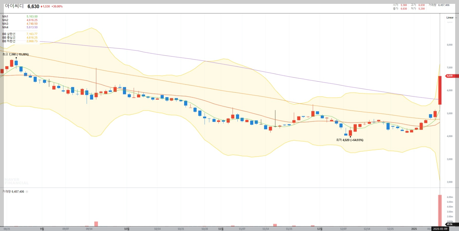 2025년 1월 9일 기준 아이씨디의 종가는 6,630원으로 전일 대비 30% 상승하며 코스닥 상승률 1위를 기록했습니다. 거래량은 약 645만 주로 활발한 매수세를 보였습니다.